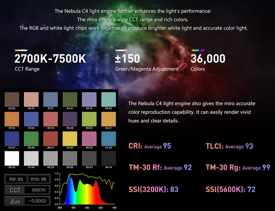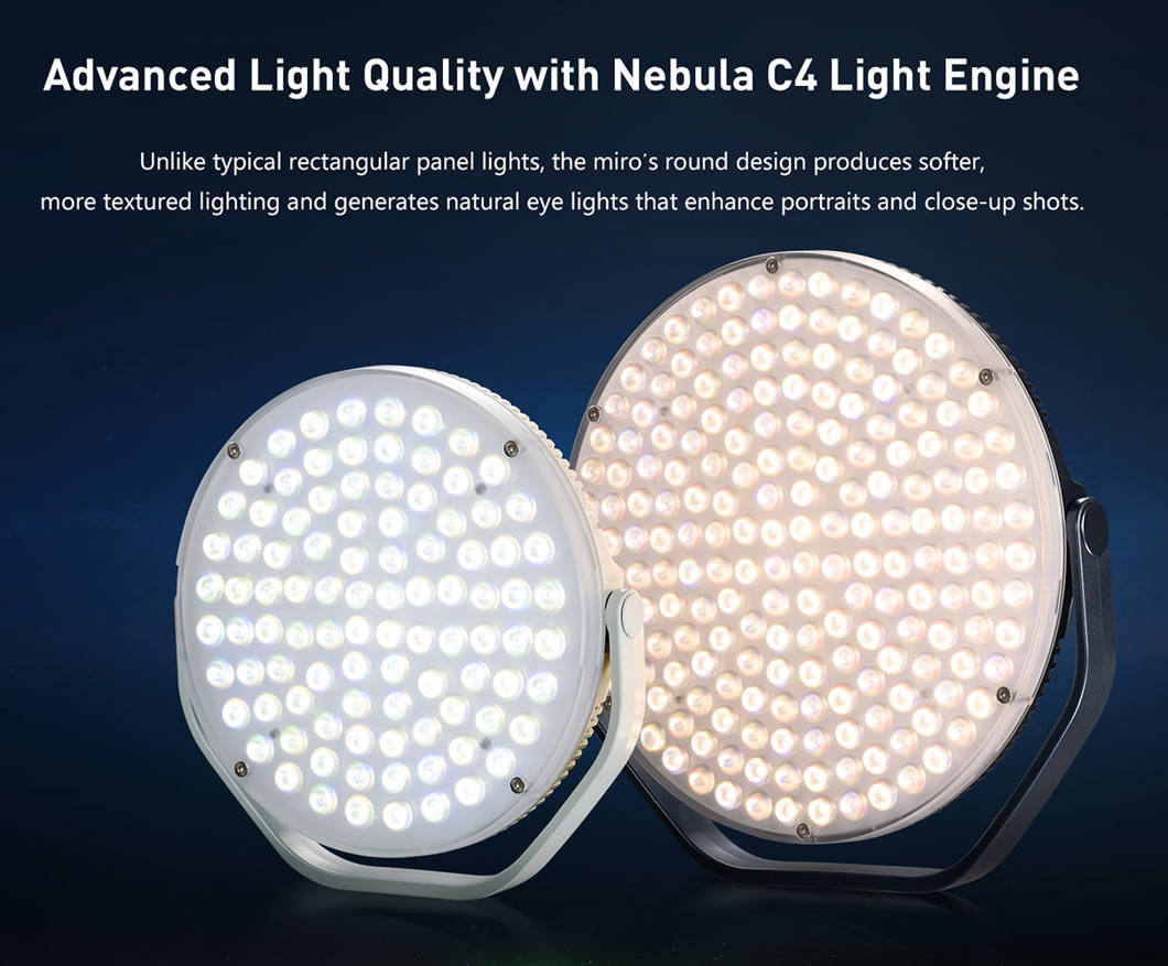 Powered by the Nebula C4 color engine, the miro 60c ensures superior color reproduction and consistency. Its CCT range of 2700K to 7500K with ±150 green/magenta adjustment makes it easy to match ambient light or integrate seamlessly with other fixtures. For creative applications, RGB mode with HSI control provides limitless color customization, while the 14 built-in lighting effects deliver fast, dynamic results for cinematic shooting.