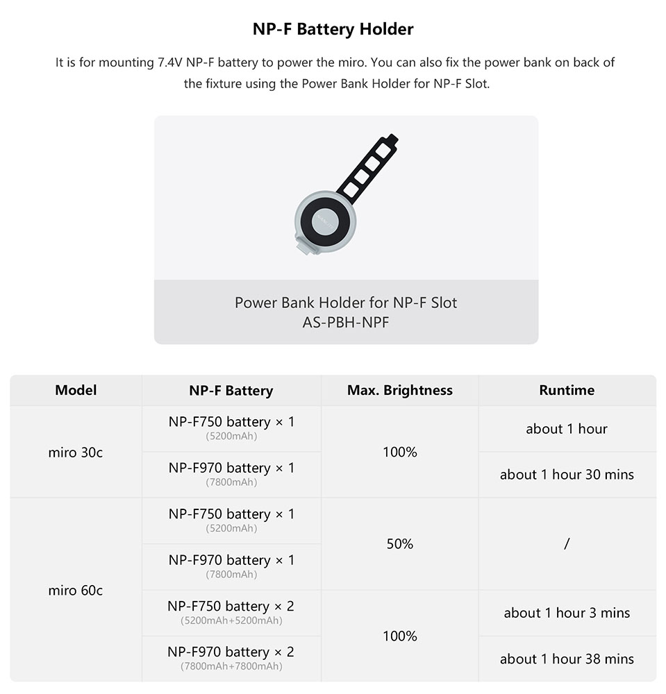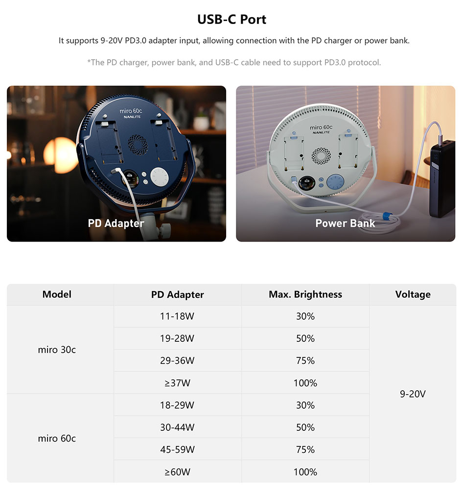 The miro 60c supports dual power solutions for any workflow: connect to USB-C PD for continuous studio use or run on NP-F batteries for portable setups. Its 45° optics ensure a concentrated, bright beam, and the included magnetic diffuser quickly softens light for flattering results. A 360° stepped yoke with 1/4"-20 mounting provides seamless integration into rigs, tripods, and studio configurations.
