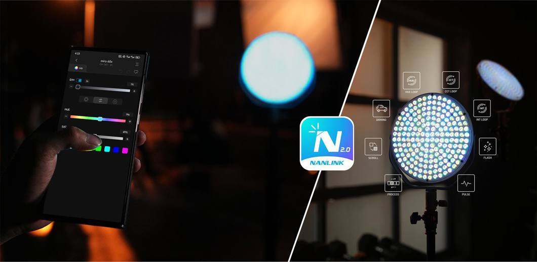 Control options are efficient and flexible. Adjust settings via the intuitive 1.28” round display or wirelessly using Bluetooth and the NANLINK app, making it simple to manage multiple lights simultaneously.